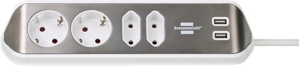 Die kompakte brennenstuhl®estilo Eck-Steckdosenleiste aus hochbruchfestem Kunststoff und hochwertiger Edelstahloberfläche bringt Ihnen Ordnung in Ihr Zuhause. Die universell einsetzbare Steckdosenleiste lässt sich als Küchensteckdosenleiste für Ihre Arbeitsplatte oder als Tischsteckdosenleiste für Ihren Arbeitsplatz durch Spezial-Klebepads leicht anbringen. Die Küchen- oder Tisch-Steckdosenleiste kann sowohl horizontal als auch vertikal angebracht werden. Sie überzeugt außerdem durch folgende Eigenschaften: Kabellänge 2 m, Kabelbezeichnung: H05VV-F 3G1,5, Steckdosen mit erhöhtem Berührungsschutz, 2 Schutzkontakt-Steckdosen in 45° Anordnung, 2 Euro-Steckdosen in 90° Anordnung
