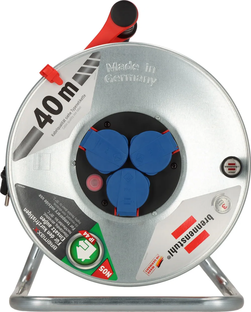 Outdoor-Kabeltrommel 40m (AT-N05V3V3-F 3G1,5) mit Bremaxx Kabel - extrem stabil, einsetzbar bis -35 °C, öl- und UV-beständig und zudem extrem abriebfest. Kabeltrommel für den kurzfristigen Außeneinsatz mit Überhitzungsschutz, Kontroll-Leuchte bei Überhitzung und Überlastung. Trommelkörper aus Stahlblech, rostgeschützt verzinkt, auf besonders stabilem Tragegestell. Kabeltrommel 40m mit 3 Schutzkontakt-Steckdosen, spritzwassergeschützt, mit selbstschließenden Deckeln. Brennenstuhl Kabeltrommel mit innovativem Tragegriff ''cablepilot'' für die perfekte Kabelführung - pendelt auf beiden Seiten und ermöglicht bequemes Tragen und Aufhängen. Made in Germany.