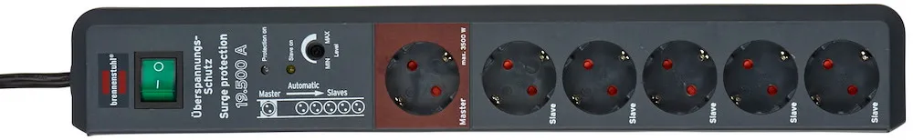 Die Secure-Tec 6er Mehrfach-Steckdosenleiste von Brennenstuhl in der Farbe anthrazit und 3m Kabel besticht durch ihre Qualität und Sicherheit in allen Bereichen. Das Gerät hat ein praktisches Automatik-Schaltsystem mit Master Slave Funktion. Das Master-Gerät (z.B. einen Computer) kann die Slave-Geräte (z.B. Monitor, Soundsystem, Drucker, Scanner usw.) in die automatische Steuerung mit einbeziehen. Mit dem Ein/Aus Schalter des Gerätes (in roten Master-Steckdose eingesteckt) können alle Geräte (in den Slave-Steckdosen) automatisch mit ein und ausgeschaltet werden. Sie verfügt nicht nur über einen erhöhten Berührungsschutz, sondern überzeugt außerdem durch folgende Eigenschaften: Schützt wertvolle Geräte vor Überspannungen mit einem max. Ableitstrom bis zu 19.500 A, mit dem Ein/Aus Schalter des Gerätes, welches in der Master-Steckdose eingesteckt ist, können alle Geräte in den Slave-Steckdosen automatisch mit ein- und ausgeschaltet werden, hoher Komfort durch 1 Master (3500 W) und 5 Slave-Steckdosen (3500 W), einstellbare Schaltschwelle (ca. 8 bis 80 W), je eine Funktionskontroll-Leuchte für Überspannungsschutz und Slave-Steckdosen, Sicherheitsschalter beleuchtet, zweipolig ein-/ausschaltbar, Steckdosen mit erhöhtem Berührungsschutz in praktischer 45°-Anordnung, Gesamtleistung max. 16 A/3500 W, extra langes Kabel 3 m, Nennstrom 16 A, Entstörfilter