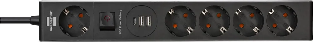 Die 5-fach Steckdosenleiste mit Power-Delivery von Brennenstuhl in der Farbe grau/schwarz ermöglicht Ihnen schnelles Aufladen Ihrer USB-fähigen Geräte. Die Schutzkontakt-Steckdose mit einem Charger USB C Power Delivery, 2 USB-Ladebuchsen Typ A und 1,5m Kabel besticht durch ihre Qualität und Sicherheit in allen Bereichen. Sie verfügt nicht nur über einen erhöhten Berührungsschutz, sondern überzeugt außerdem durch folgende Eigenschaften: 3 USB Ladebuchsen, Power Delivery Technologie für schnelles Aufladen, Kabellänge 1,5m, Nennstrom 16 A, 1 Permanent-Steckdose, 4 schaltbare Steckdosen (ON/OFF), Steckdosen in 45°-Anordnung
