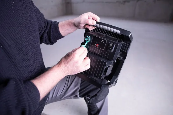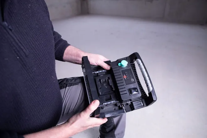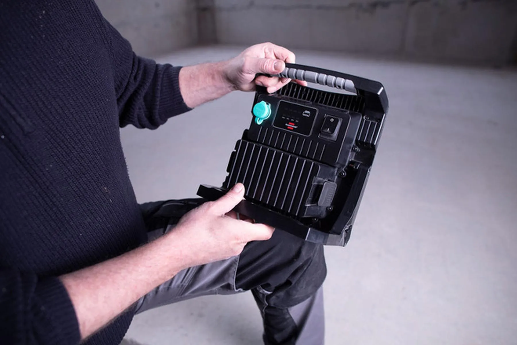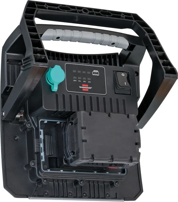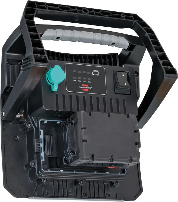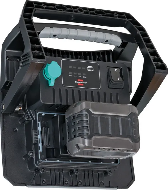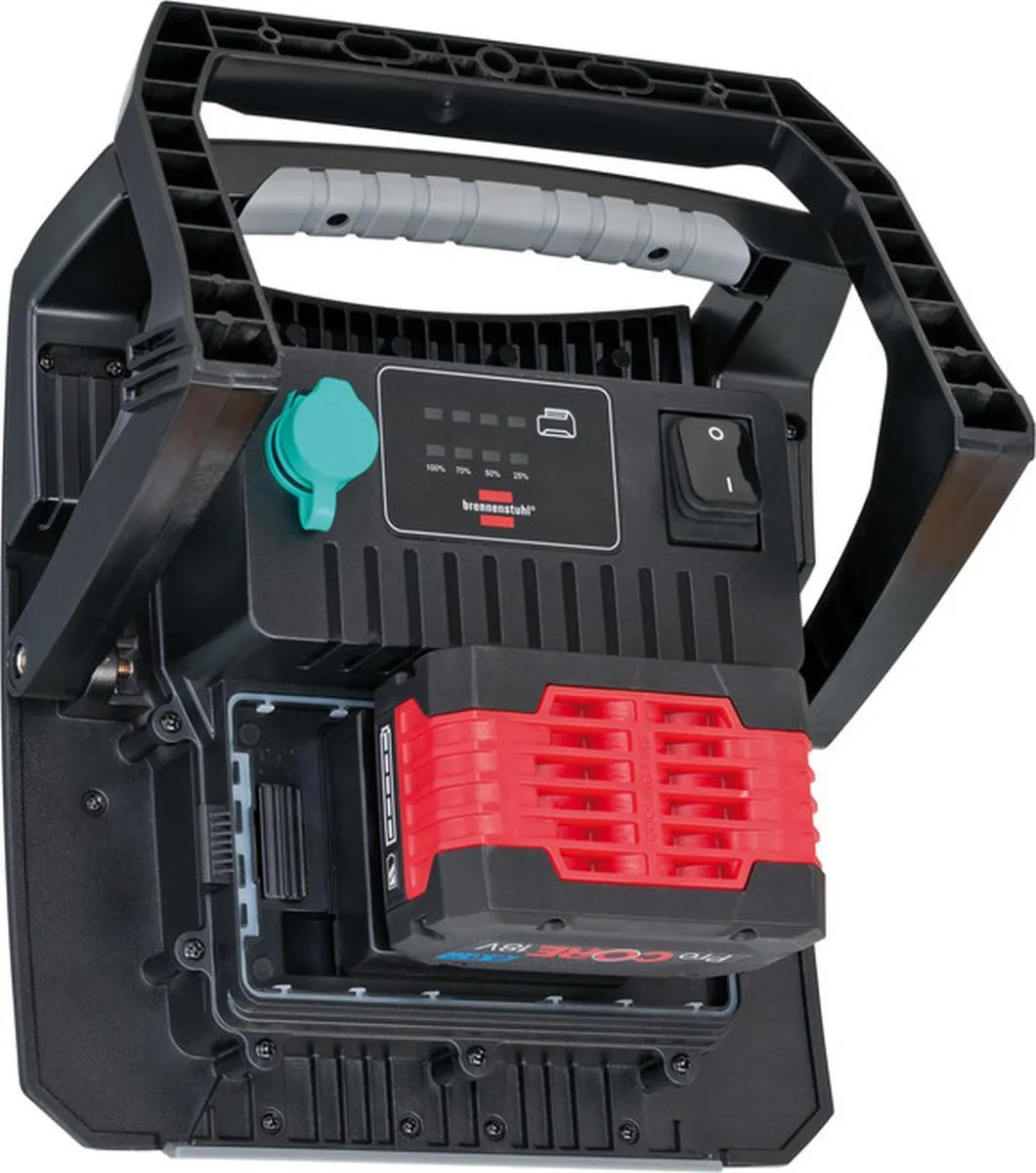 Akku LED Arbeitsleuchte 6200lm kompatibel mit verschiedenen 18V Akkus (verschiedene Ah Klassen) der 11 Powertool-Hersteller: Bosch Professional, Dewalt, Einhell, Fein, Festool, Flex, Hikoki, Makita, Metabo CAS, Milwaukee und Würth, der Baustrahler bietet bei einer Lichtleistung von 50% eine Leuchtdauer von ca. 2,7h/4Ah (ca. 1,3h/4Ah bei 100%) - die Leuchtdauer ist abhängig vom verwendeten Akku (Lieferung ohne Akku), Baustellenstrahler mit 4 Schaltstufen (100% - 75% - 50% - 25%) und Schutzsystem für Powertool Akkus: vor Tiefenentladung, Überhitzung (hervorgerufen durch hohe Lastströme) und Batteriefehler geschützt, Multi Battery LED Hybrid Strahler 6050 MH mit 5m abnehmbarem Kabel (H07RN-F2X1,0) mit Hybridtechnik: Akku- und Netzbetrieb möglich, außerdem mit automatischer Umschaltung von Netz auf Akku bei möglichem Stromausfall, Strahler inkl. 4 Schnittstellen-Adapter für die 5 Marken Bosch Professional, Dewalt, Makita, Metabo CAS, Milwaukee & Tasche - Adapter für die weiteren Marken separat erhältlich - Brennenstuhl ist Teil von AMPShare - Powered by Bosch Professional