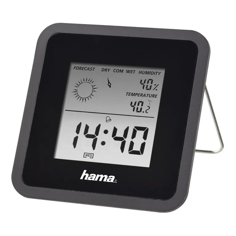 Hama Thermo-/Hygrometer ''TH50'', Schwarz - digitale Anzeige von Temperatur, Luftfeuchtigkeit, Uhrzeit und Raumluft - Komfort-Index für Luftfeuchtigkeit mit Anzeige ''zu trocken - optimal - zu feucht'' für ein gesundes Raumklima Thermometer: - Wettervorhersage: sonnig, bewölkt, leicht bewölkt, regnerisch - umschaltbar zwischen Grad Celsius und Fahrenheit - max./min. Datenspeicher für Temperatur Uhr-/Kalender-/Weckfunktion: - Uhrzeit umschaltbar 12-/24-h-Format - Datum und Wochentagsanzeige - Alarmanzeige - Schlummerfunktion Hygrometer: - Trendanzeige für Luftfeuchtigkeit Technische Eigenschaften: - Farbe: Schwarz - Farbe Akeneo: Schwarz - Farbton: Schwarz - Anzeige: Datum - Art: Thermo-/Hygrometer - Betriebsart: Manuell - Display: Digital - Messbereich (außen): 0°C bis +50°C - Messbereich (innen): 0°C bis +50°C - Montage: Stehend - Uhrfunktion: Ja (mit 12/24) - Zusatzfunktionen: Alarmfunktion, Datenspeicher, Komfortanzeige, Schlummerfunktion, Wettervorhersage - Breite x Tiefe x Höhe: 8 x 1,2 x 8 cm - Anzahl Batterien Station: 1 - Batterietyp Station: CR2025 Lieferumfang: - 1 Thermo-/Hygrometer ''TH50'' - 1 Batterie CR2025 - 1 Bedienungsanleitung
