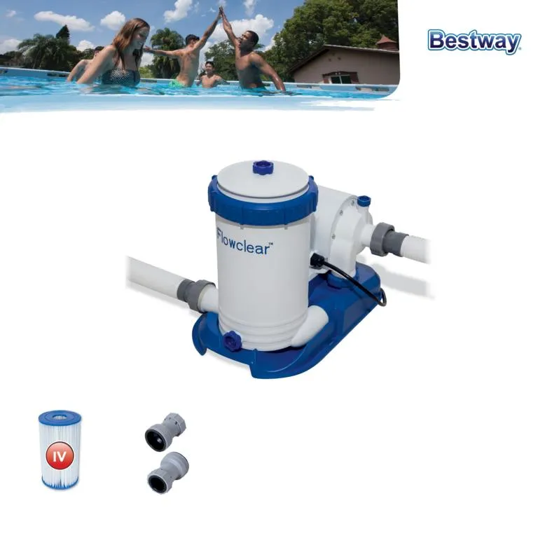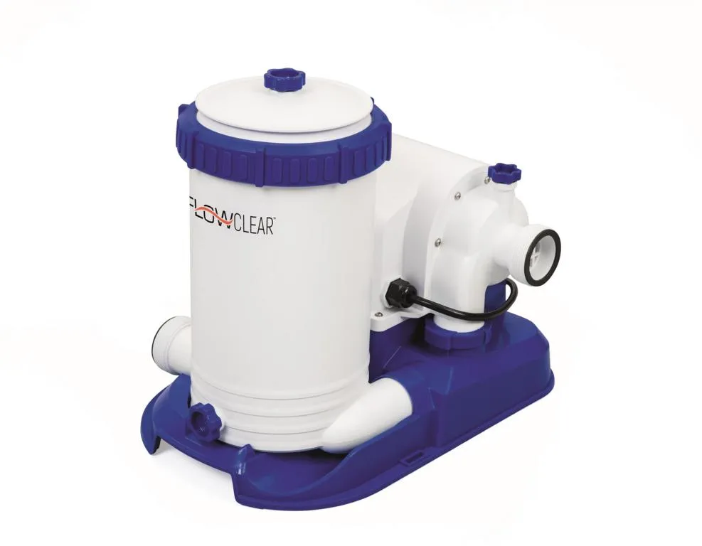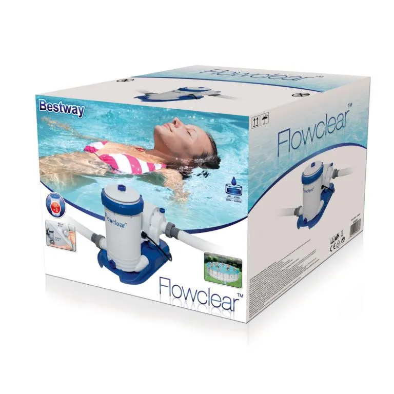 Flowclear™ Filterpumpe 9.463 l/h • GS-zertifiziert (TÜV Rheinland) • ~220-240 V, 350 W • Durchflussrate: 9.463 l/h • Für Pools mit einer Wasserkapazität von 1.100-62.000 l geeignet • Ø 38 mm Schraubanschluss • Zusätzlich im Lieferumfang enthalten: · für den Betrieb notwendige Filterkartusche #58095 Gr. IV (14,2 x 25,4 cm) · 2x Schläuche à 4,5 m / Durchmesser 38 mm · 1x Pooleinlass-Sieb, 1x Poolauslass-Sieb für Ø 32mm · Ø 32 mm Anschlussadapter mit Schlauchklemmen (je 2 Stück) • Farbkarton • Kundenservice • VE: 1 / 13,136 kg brutto Die 9.463 Liter Flowclear™ Filterpumpe von Bestway® ist der wichtige und notwendige Garant für sauberes Wasser in Ihrem Pool. Die Filterpumpe sorgt für eine stabilen Kreislauf, indem Ihr Poolwasser mithilfe einer Filterkartusche effektiv gereinigt wird und anschließend zurück in den Pool geleitet wird. Die zwei im Lieferumfang Schläuche, verbinden jeweils an zwei Punkten den Pool mit dem Filtersystem. Mit einer Durchflussrate von 9.463 l/h ist diese Filterpumpe Empfohlen für Pools mit einer Wasserkapazität von 1.100-62.000 Liter geeignet.