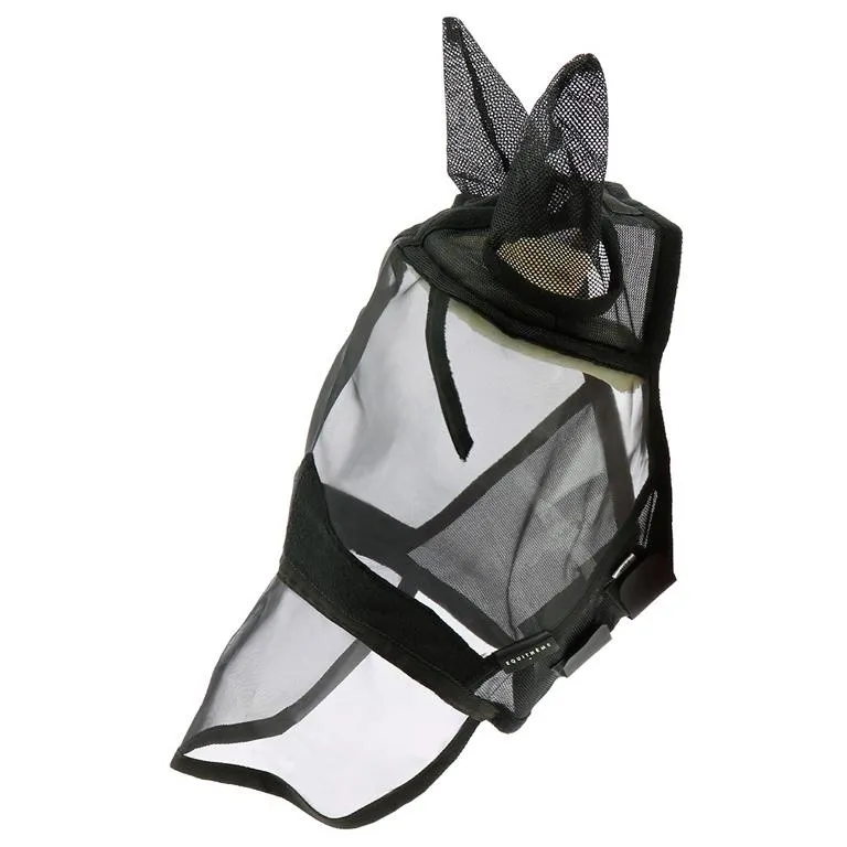 Leichte und robuste Fliegenmaske. Rundumschutz dank integriertem Nüsternschutz. Mesh an Ohren und Gamaschen für mehr Tragekomfort. Mit Fleece unterlegte Kanten. Genickstück mit weichem Kunstfell gepolstert. Einfahes und schnells Anpassen dank Schopfschlitz und zwei Klettstreifen. Material: Polyester / PVC