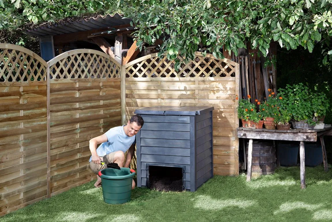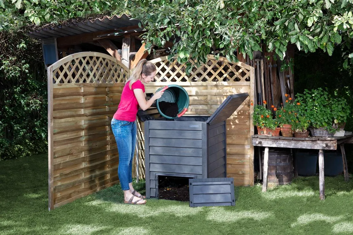 Hergestellt aus 100% Recycling-PP Komposter mit Holzdekor Stabiler, robuster Komposter Bequemes Befüllen durch zwei große Einfüllklappen Praktische Kompostentnahme durch zwei Entnahmeklappen Ausgeklügeltes Belüftungssystem: Lüftungsöffnungen an allen vier Seiten unterhalb der Holzschalung verdeckt Seitenwände bleiben ganzflächig dekorativ Hergestellt aus dem Qualitätswerkstoff Thermolen Zubehör: Bodengitter (nicht im Lieferumfang enthalten) Thermolen® Der neue und innovative Qualitätswerkstoff: Thermolen® wird geschäumt, wodurch sehr gut isolierende Wände entstehen. Die entstehende Wärme (Sonneneinstrahlung, Mikroorganismen) bleibt im Inneren des Komposters und beschleunigt die Verrottung. Thermolen® ist ein UV- und witterungsbeständiger Kunststoff und sorgt für eine lange Lebensdauer des Komposters. Thermolen® wird nachhaltig aus 100% recyceltem Polypropylen hergestellt und ist zu 100% recycelbar.
