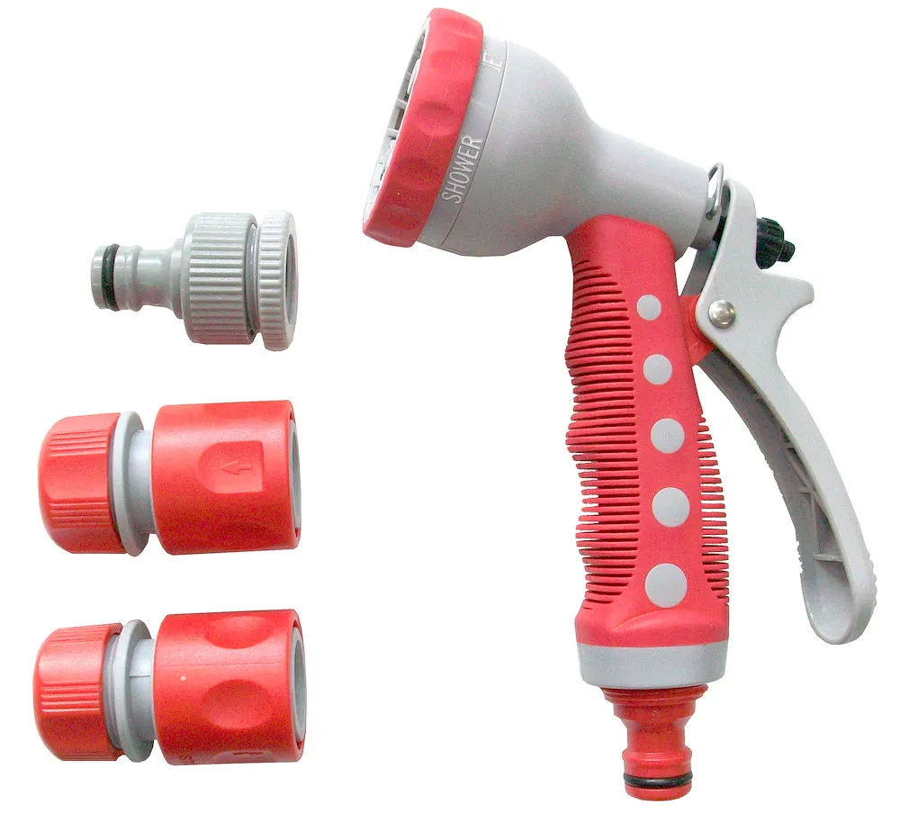4-teiligSprühpistole mit 6 verschiedenen Strahl-arten '' Stufenlose Durchflussregulierung und Feststeller '' Ergonomisch geformter 2-Komponenten-Griff '' Hahnstück 3/4 + 1 '' Schlauchstück 1/2 '' Wasserstop 1/2