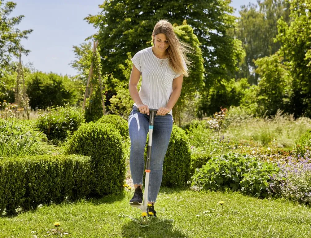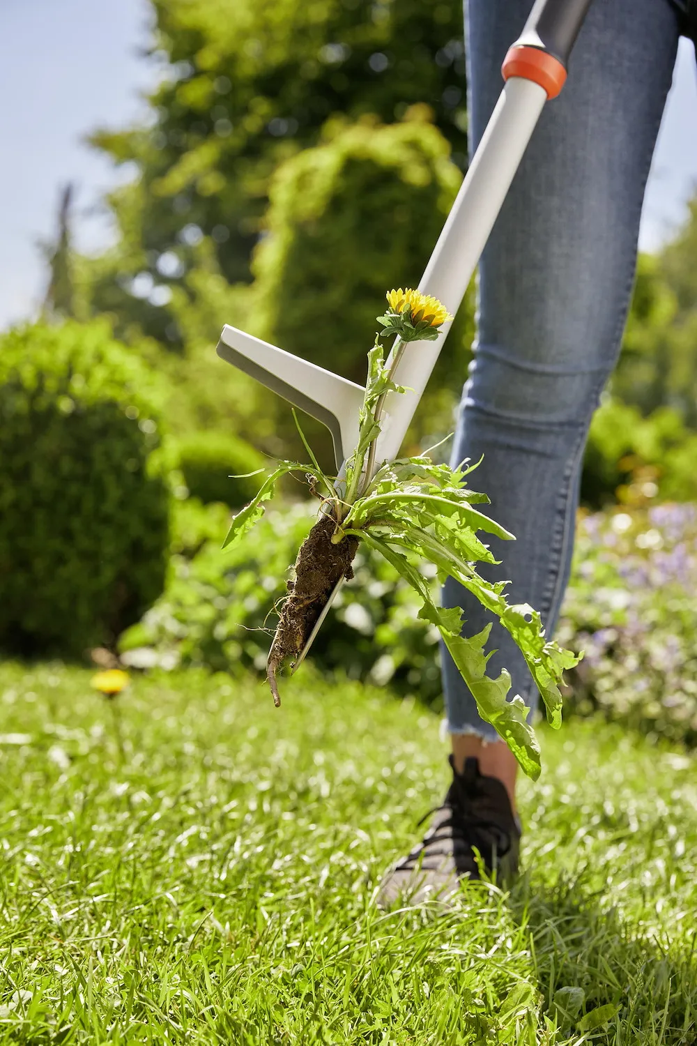 Der GARDENA Unkrautstecher eignet sich optimal für das einfache und präzise Entfernen von Unkraut, vor allem von Löwenzahn im Rasen. Die zwei patentierten Spezialmesser liegen dicht beieinander, ermöglichen ein leichtes Eindringen in den Boden und müheloses, vollständiges Herausziehen des Unkrauts. Dadurch entstehen auch nur kleine Löcher. Der Fußtritt erleichtert zusätzlich das Einstechen in den Boden. Der speziell geformte Griff unterstützt die Kraftübertragung beim Drehen. Der integrierte Auslösemechanismus erleichtert das Auswerfen des Unkrauts ohne Bücken und schmutzige Hände. 25 Jahre Garantie.