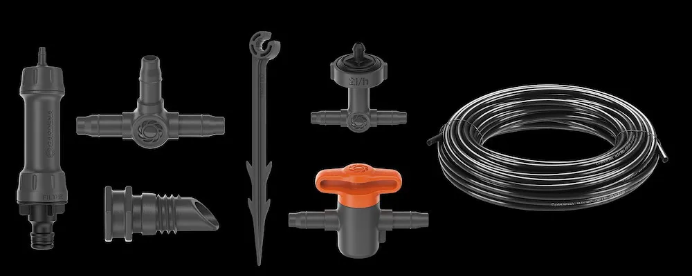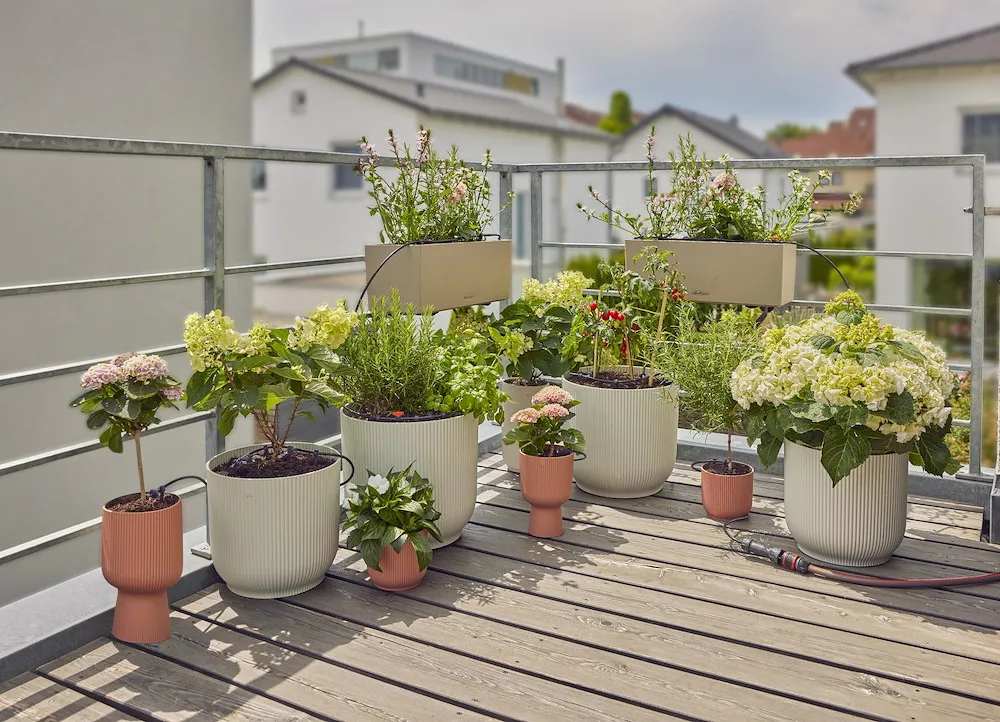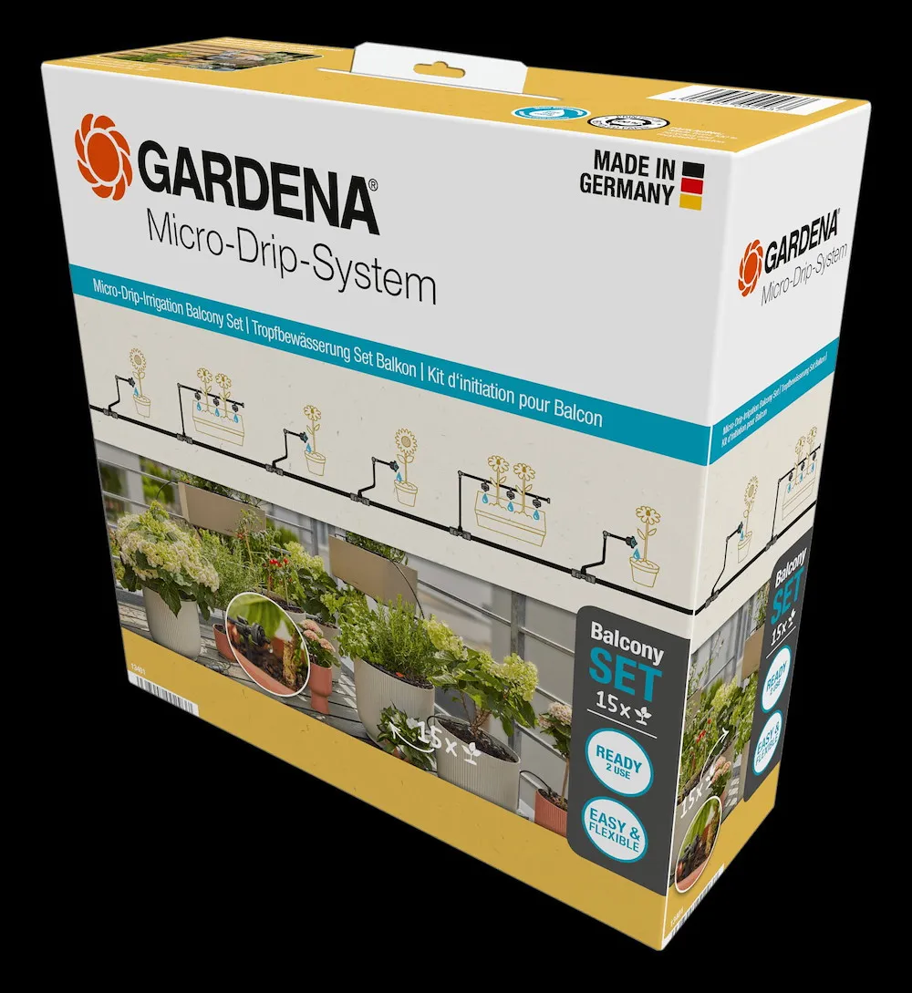 Das wassersparende Tropfbewässerung Set Balkon von GARDENA versorgt bis zu 15 einzelne Topfpflanzen oder Pflanzen in Blumentrögen mit Höhenunterschied zuverlässig mit Wasser. Im sofort einsatzbereiten Ready-2-Use-Set sind alle benötigten Komponenten enthalten und in nur wenigen einfachen Schritten installiert. Durch die einzigartige Easy & Flexible Verbindungstechnik ist die flexible Erweiterung des Micro-Drip-Systems jederzeit möglich. Zudem können die selbstregulierenden und selbstschließenden Reihentropfer flexibel in Blumenkästen und als Endtropfer für einzeln stehende Topfpflanzen eingesetzt werden. Für eine noch größere Zeit- und Wasserersparnis kann das Set zum Beispiel mit der GARDENA Bewässerungssteuerung Flex (Art.-Nr. 1890-20) kombiniert werden. Dadurch werden die Balkonpflanzen auch bei eigener Abwesenheit durch definierte Zeitpläne automatisch bewässert.