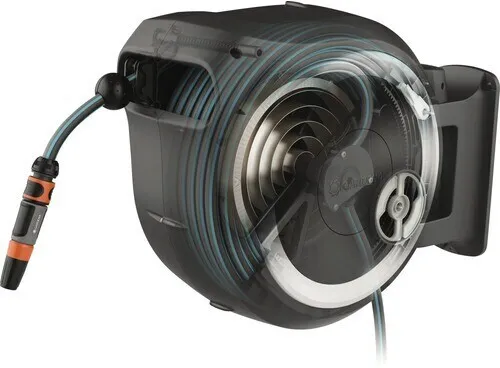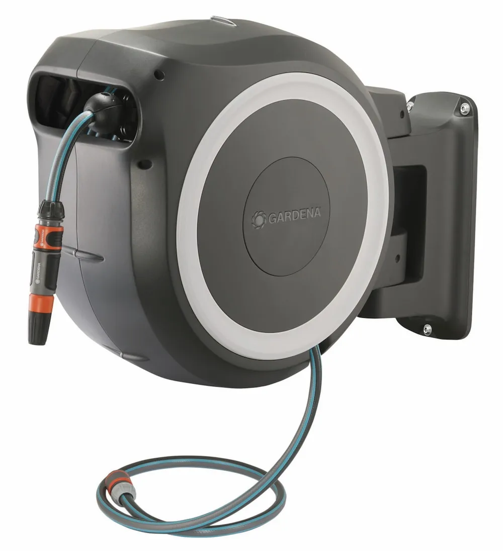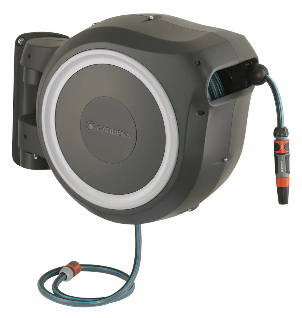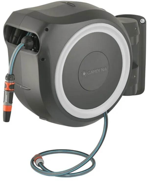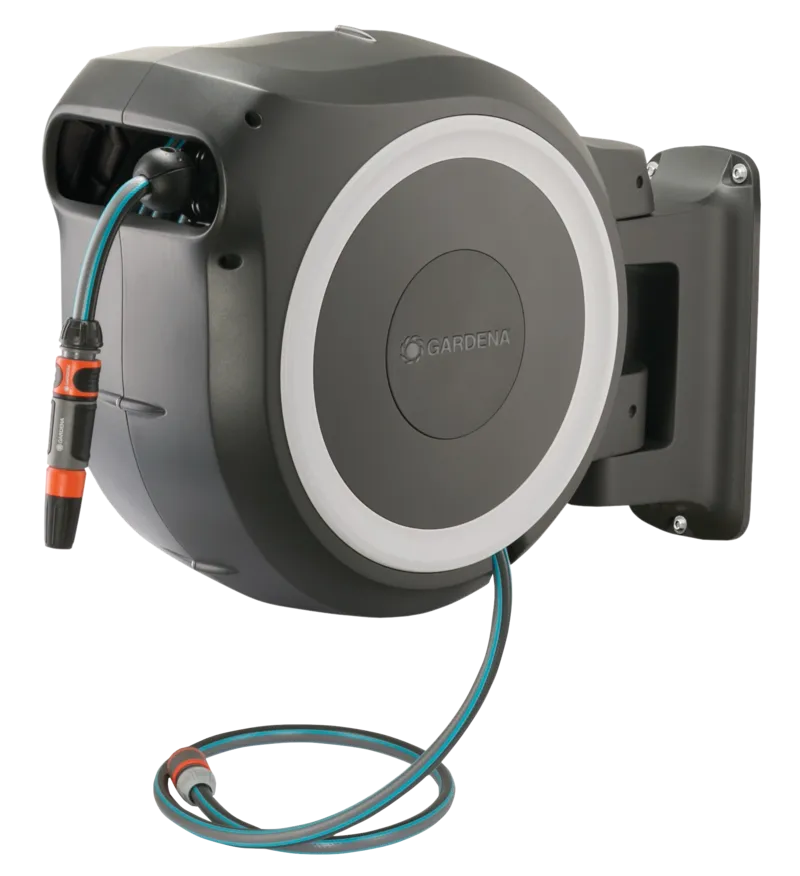 Mit der GARDENA Wand-Schlauchbox RollUp M/L ist der Gartenschlauch sofort einsatzbereit und nach der Bewässerung schnell und ohne zu verknoten verwahrt, geschützt vor Schmutz und Beschädigungen. Mit kurzen Arretierstopps kann der Schlauch auf die gewünschte Länge ausgezogen werden. Dank RollControl genügt ein kurzer Zug am Schlauch und er wird mit gleichmäßiger Geschwindigkeit und sicher automatisch wieder aufgerollt. Die Wandhalterung ist um 180° schwenkbar, mit praktischer Halterung zum Aufbewahren von GARDENA Spritzen oder Brausen. Die Wandschlauchbox ist frostsicher. Mit 25 m Qualitätsschlauch 13 mm (1/2''), Anschlussschlauch, Original GARDENA Systemteilen und Spritze. Inklusive Wandhalterung mit Schrauben, Dübeln und Montagehilfe. Mit Diebstahlsicherung. 5 Jahre Garantie.