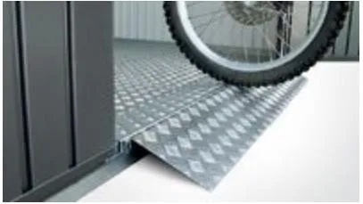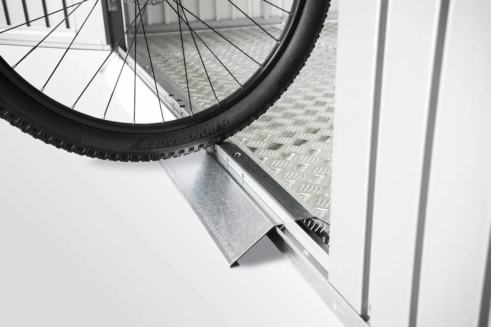 Für das bequeme Überfahren mit schweren Geräten, Zweiteilig, für die Innen- und Außenseite, nur bei ALU-Bodenrahmen und Doppeltür möglich, kann nicht gemeinsam mit dem SmartBase-Fundament und SmartBase PLUS-Fundament verwendet werden
