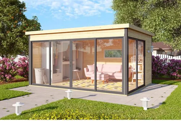 Hochmodern ist das Designhaus 412 mit Glasschiebetür und minimalistischen Aluminium-Profilen. Die Tür und das Fenster, eingefasst im dunklen Rahmen, passen zum zeitgemäßen Design des Hauses. Es ist 418 cm breit 322 cm tief. Schalten Sie ab vom Alltag und genießen Sie den Ausblick aus dem Designhaus 412.