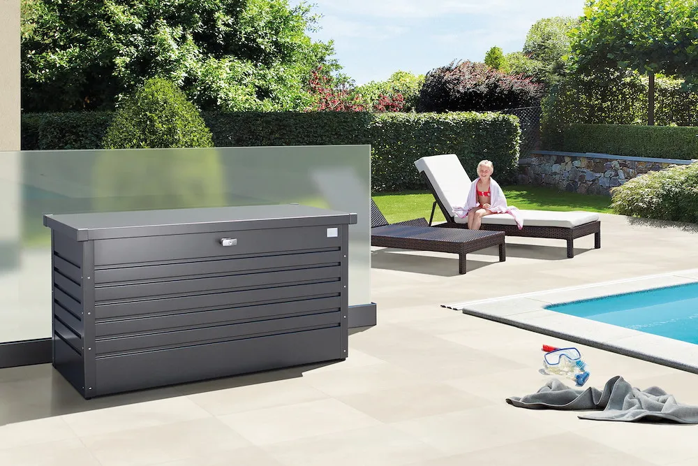 Die Gartenbox steckt locker all das weg, wofür Sie keinen geeigneten Aufbewahrungsort haben. Ideal zum Verstauen von Sitzkissen, Sonnenliegen, Klappstühlen, Spielzeug, Sport- und Campingutensilien. Die ideale Aufbewahrungsbox für allerlei Krimskrams im Freien! Durch hochwertige Materialien eine dauerhafte Lösung.