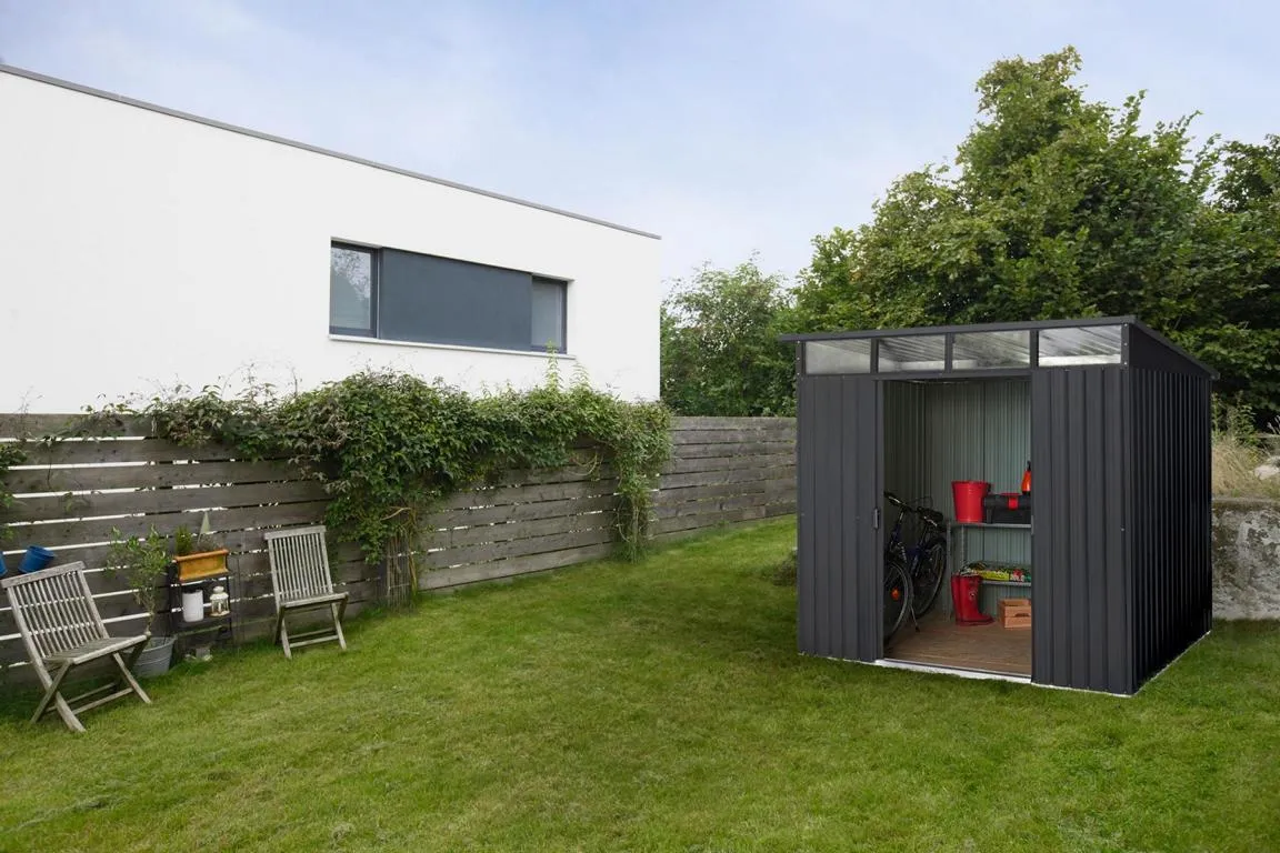 Metallgerätehaus mit Pultdach und Lichtband, Komfortables Gerätehaus mit breiten Schiebetüren und Lichtband, Modernes Blechdesign mit feinen Rippen für hohe Steifigkeit, Lüftung in das Blech gestanzt - kein zusätzliches Plastik, Verzinktes Stahlblech Polyesterlackierung schützt zusätzlich vor Rost und Kratzern, Schiebetüren: auch bei Schneefall leicht zu öffnen, Fundamentrahmen optional erhältlich, Grundfläche: ca. 6,62 m², Außenmaße (BxTxH): 238x278x203 cm, Türmaße (BxH): 103x173 cm, Farbe: Anthrazit matt *Garantiebedingungen unter: www.vitavia.de/service/garantiebestimmungen,Alle Maßangaben sind Annäherungswerte. Technische Änderungen vorbehalten