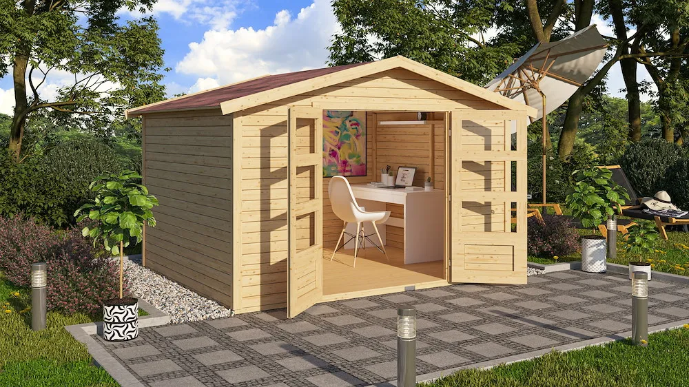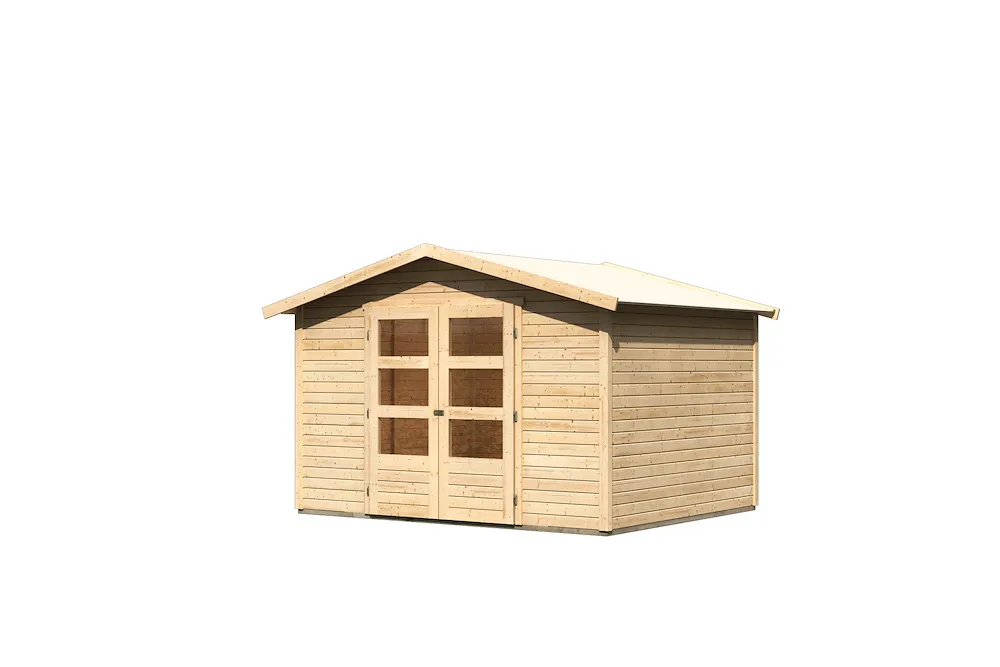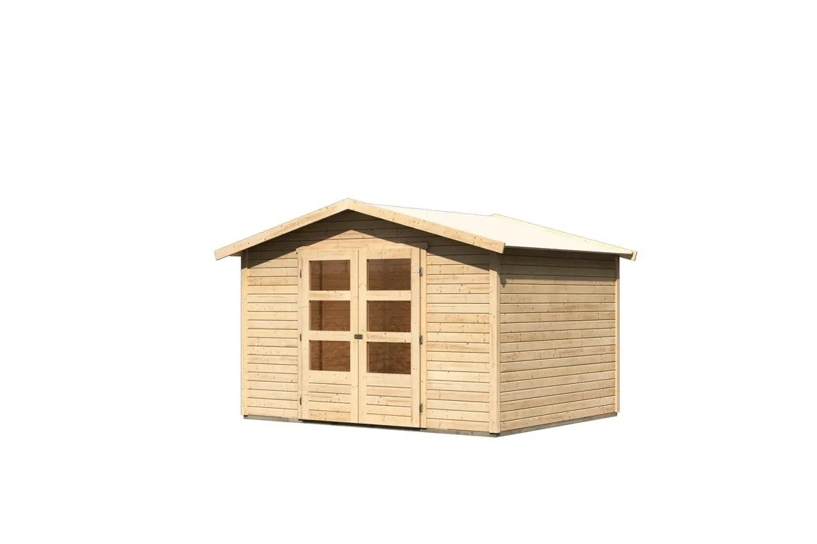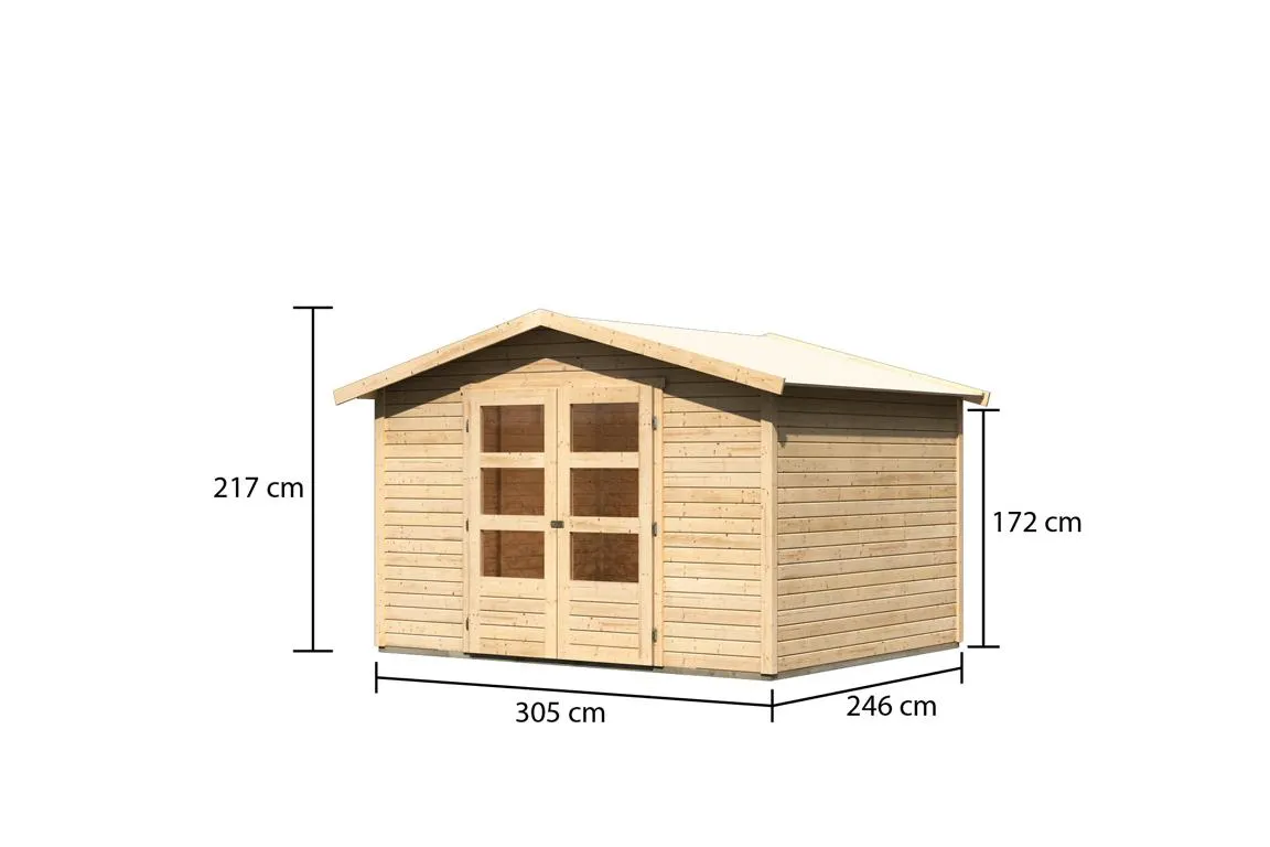 Das Gartenhaus wird aus 19 mm starken Wandbrettern aus nordischer Fichte im Steck-/Schraubsystem gefertigt und gewährleistet somit einen einfachen Aufbau. Das Satteldach besteht aus Dachplatte. Die Grundfläche beträgt 7,1 qm bei einem umbauten Raum von 14,1 cbm. Mit einer Seitenhöhe von 172 cm und einer Firsthöhe von 217 cm bietet das Gerätehaus optimale Raumnutzung. Das Gartenhaus ohne Anbauten hat ein Sockelmaß von 302 cm x 242 cm. Bodenbalken sorgen für den Schutz von unten und werden unter das Gartenhaus gelegt. Durch die Kesseldruckimprägnierung der Bodenbalken sind diese vor Witterungseinflüssen und holzzersetzenden Pilzen bereits geschützt. Die praktische und vormontierte Tür sorgt mit ihren großzügigen Abmessungen und dem Massivholzrahmen für einen einfachen Zutritt in das Gartenhaus und sichert den Inhalt nebenbei effektiv vor unbefugtem Zugriff. Die Verglasung der Lichtausschnitte sorgt für großzügigen Tageslichteinfall.