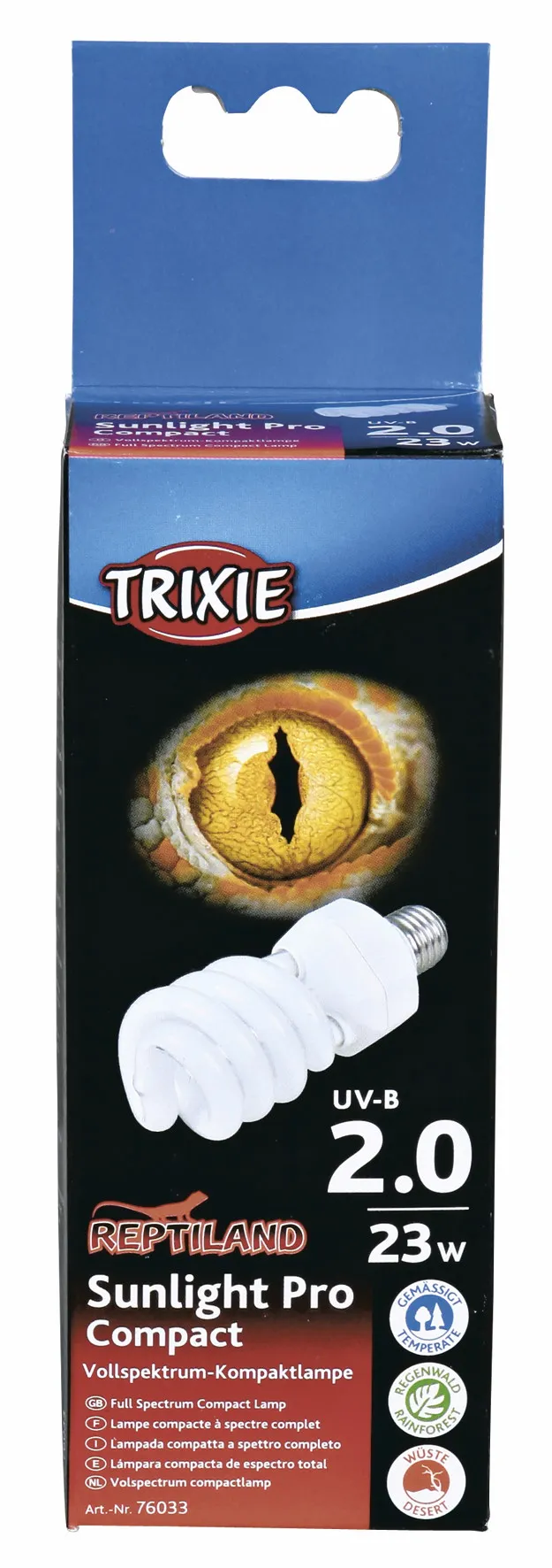 UV-Vollspektrum-Kompaktlampe optimales Lichtspektrum mit geringen UV-B- und UV-A-Anteilen für Reptilien, Amphibien und Spinnentiere in Terrarien realisiert natürliche Lichtverhältnisse emittierte UV-A-Strahlen fördern Aktivität, Fortpflanzung und Appetit erzeugtes Tageslichtspektrum fördert Pflanzenwachstum ideal zur Unterstützung von Reptiland Tropic Pro und Dessert Pro Leuchtstoffröhren für eine optimale Lichtversorgung