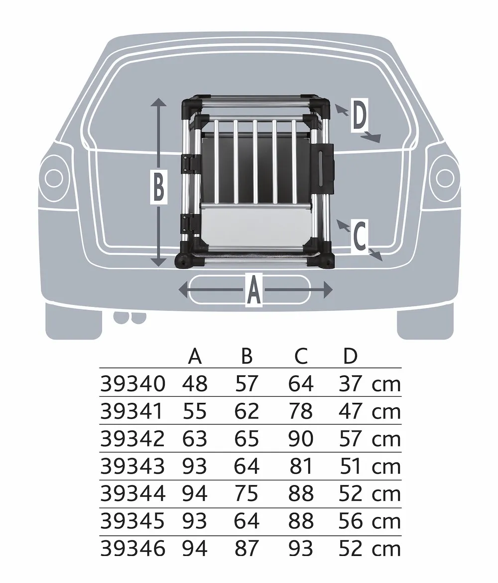 extra stabil, sicher und geräuscharm hochgeschlossene Wände für einen sauberen Standplatz gute Luftzirkulation Sicht durch die Heckscheibe möglich optimale Ausnutzung des Kofferraums durch abgeschrägte Seiten Tür mit Sicherheitsverschluss geschlossener unterer Türbereich verhindert Herausstrecken der Pfoten mit rutschfester Liegematte: Maschinenwäsche bis 30 °C Klettleisten unter dem Boden für einen sicheren Stand im Kofferraum Einsatz für Vorhängeschloss separat erhältlich (Artikel 39319) Innenverkleidung separat erhältlich (Artikel 39310 39316) Aluminium/Hartfaserplatten/Kunststoff Farbe: silber/hellgrau tierschutzkonform nach § 18 (AT) Informationen zur tierschutzkonformen Verwendung siehe www.tierschutzkonform.at