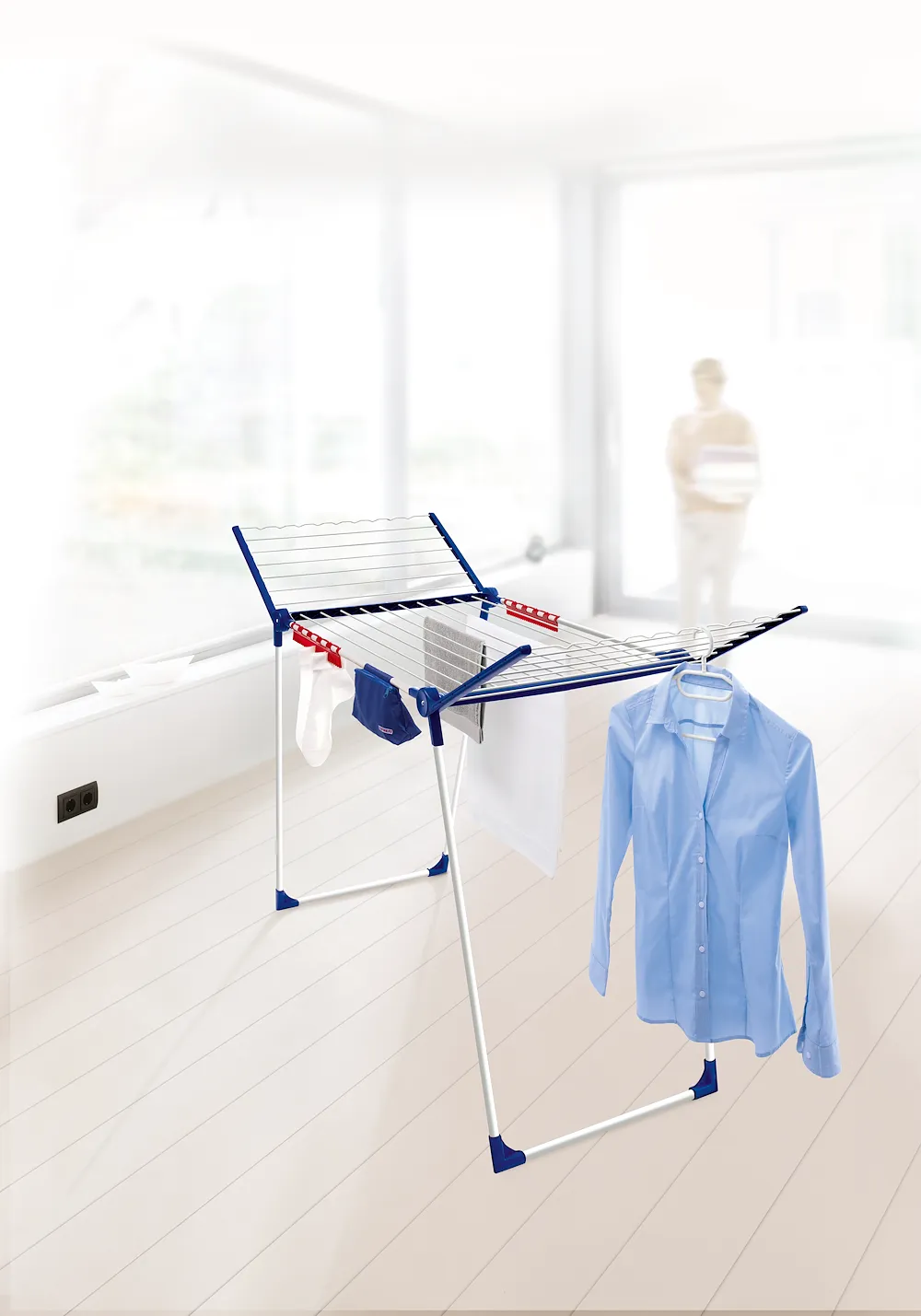 Der Standtrockner Pegasus 200 Solid Comfort besitzt alles, was ein mobiler Trockenplatz braucht: Mit seinen parallelen Standbeinen steht er drinnen wie draußen äußerst stabil und standfest. Seine Trockenlänge beträgt stattliche 20 Meter und bietet Platz für rund zwei Waschmaschinenfüllungen. Lange Wäschestücke wie Badehandtücher oder Hosen trocknen auf den seitlichen, aufklappbaren Flügeln, auf denen mit einer Höhe von 107 cm nichts auf dem Boden schleift. Die beiden äußeren Leinenstäbe der Flügel eignen sich dank ihrer Wellenform perfekt für das Aufhängen von Kleiderbügeln. Fünf windfeste Bügel sind im Lieferumfang enthalten. Sie rasten ein und fallen selbst bei starkem Wind nicht von der Stange. Extra bietet der Pegasus 200 Solid Comfort einen Wäscheklammerbeutel, der mit einem Klettverschluss schnell und einfach an einem der Trockenstäbe befestigt ist und die Wäscheklammern stets griffbereit hält. Ebenfalls inklusive sind zwei Kleinteilehalter. Ohne Wäscheklammern lassen sich hier Socken, Handtücher oder Slips schnell und einfach aufhängen. Der Standtrockner Pegasus 200 Solid Comfortist leicht aufzustellen und ebenso leicht und schnell zusammengeklappt. Die Trockenstäbe besitzen eine spezielle Pulverbeschichtung und sind dauerhaft rostgeschützt.