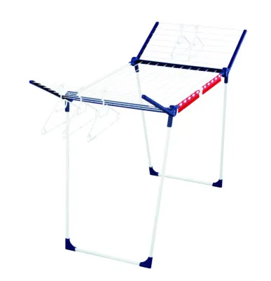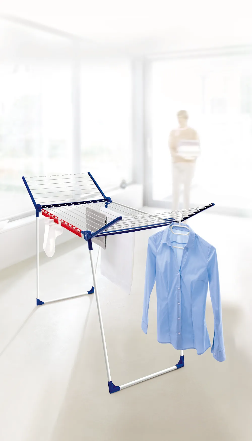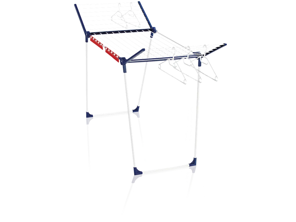 Der Standtrockner Pegasus 200 Solid besitzt alles, was ein mobiler Trockenplatz braucht: Mit seinen parallelen Standbeinen steht er drinnen wie draußen äußerst stabil und standfest. Seine Trockenlänge beträgt stattliche 20 Meter und bietet Platz für rund zwei Waschmaschinenfüllungen. Lange Wäschestücke wie Badehandtücher oder Hosen trocknen auf den seitlichen, aufklappbaren Flügeln, auf denen mit einer Höhe von 107 cm nichts auf dem Boden schleift. Die beiden äußeren Leinenstäbe der Flügel eignen sich dank ihrer Wellenform perfekt für das Aufhängen von Kleiderbügeln. Fünf windfeste Bügel sind im Lieferumfang enthalten. Sie rasten ein und fallen selbst bei starkem Wind nicht von der Stange. Ebenfalls inklusive sind zwei Kleinteilehalter. Ohne Wäscheklammern lassen sich hier Socken, Handtücher oder Slips schnell und einfach aufhängen. Der Standtrockner Pegasus 200 Solid ist leicht aufzustellen und ebenso leicht und schnell zusammengeklappt. Die Trockenstäbe besitzen eine spezielle Pulverbeschichtung und sind dauerhaft rostgeschützt.
