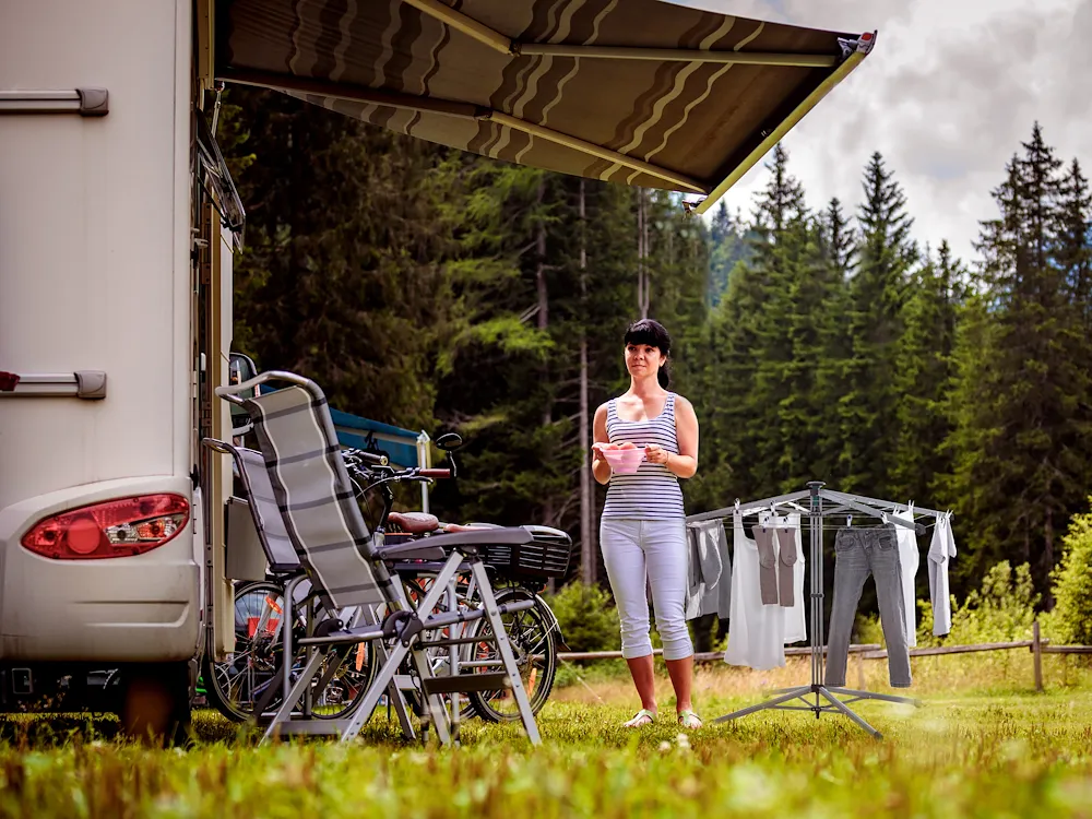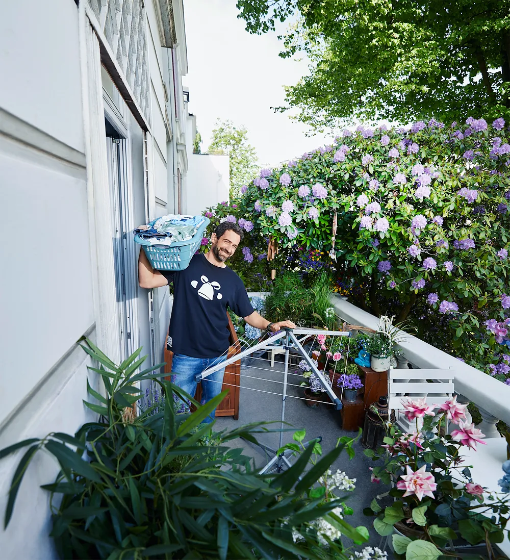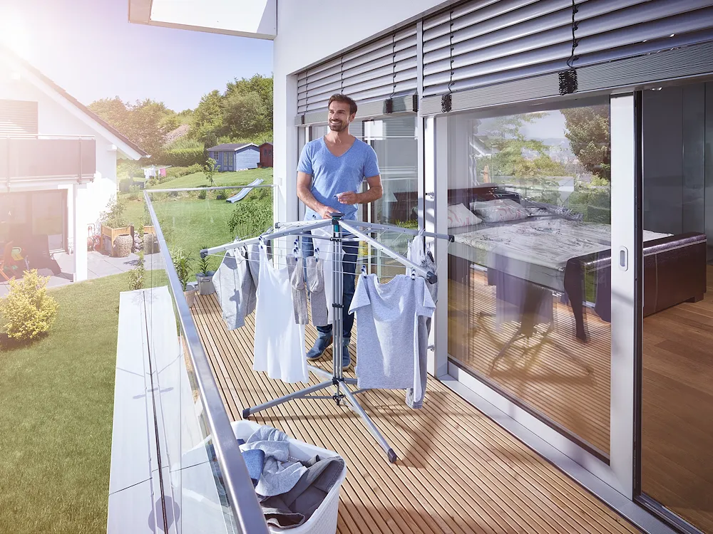 Mit einer Hand aufgebaut, kompakt verstaut. Die LinoPop-Up 140 ist die perfekte Lösung für Zuhause und Unterwegs. Einfach am zentralen Griffstück nach unten drücken, die vier Leinenarme klappen sanft auf und arretieren schon ist die Standwäschespinne einsatzbereit. Ideal nicht nur für Zuhause, den schmalen Balkon, die kleine Terrasse oder das Bad, sondern auch perfekt für Unterwegs beim Campen und Caravaning. Denn die LinoPop-Up 140 ist mit einem Gewicht von nur 3,6 kg auch wunderbar leicht und gut zu transportieren. Auseinandergeklappt bietet die Einhand-Wäschespinne mit 14 Meter Leinenlänge genügend Platz für mehr als eine Waschmaschinenfüllung auf nicht einmal einem Quadratmeter Stellfläche. Die Leinen sind von innen nach außen leicht abfallend angeordnet, sodass man problemlos jede Leine erreicht. Mit einer Höhe von 95 cm bietet selbst die äußerste Leine die Möglichkeit lange Wäschestücke wie beispielsweise Badehandtücher oder Hosen zu trocknen. Dabei sorgen die stabilen Leinenarme und die breite Aufstellfläche, auch voll beladen, für einen sicheren Stand. Durch Druck auf den Bediengriff lassen sich die Leinen einfach und bequem nachspannen. Wird die praktische Standwäschespinne nicht mehr gebraucht, lässt sie sich ebenso leicht schließen wie öffnen: einfach mit einer Hand die Arretierung lösen, gleichzeitig die LinoPop-Up anheben und die Arme falten sich zusammen. Zusammengeklappt ist die Standwäschespinne LinoPop-Up 140 mit nur 12 cm ausgesprochen schmal und kann platzsparend im Wohnwagen oder im Caravan, in kleinen Bädern oder in der Abstellkammer untergebracht werden. Eine Schutzhülle erleichtert den Transport und hält die Leinen sauber.