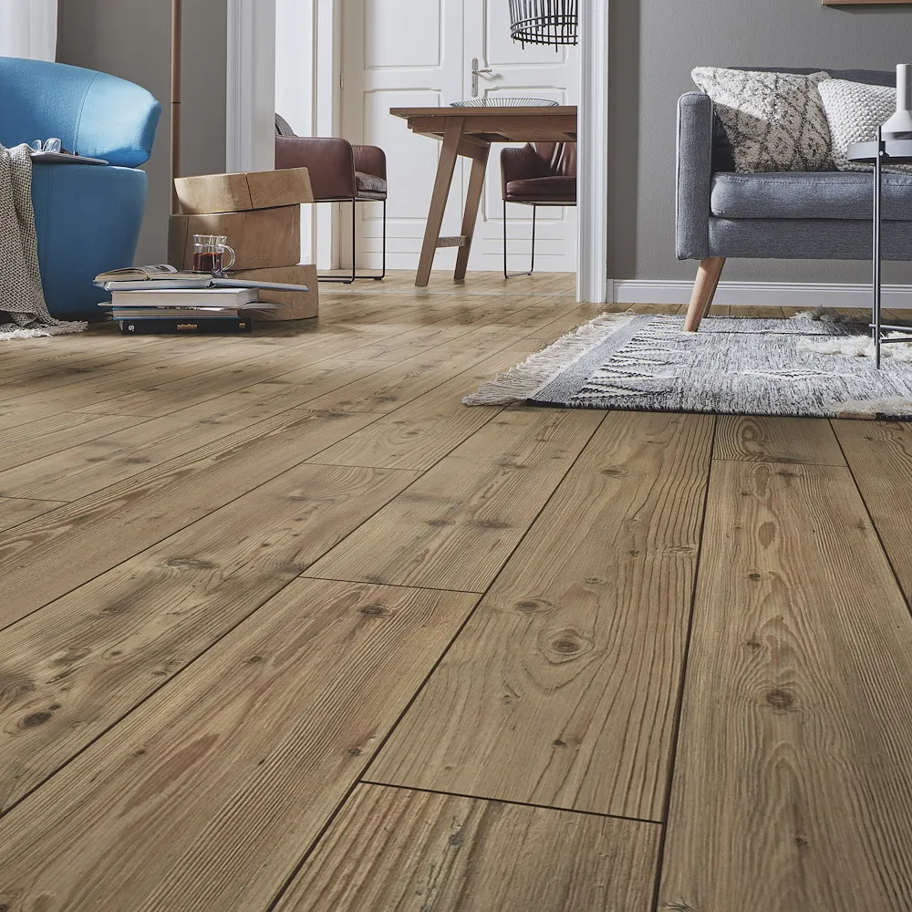 Das Dekor Natural Pine leuchtet in natürlichen, goldigen Holzfarben. Die Holzmaserung erfüllt jeden Raum mit Sonnenlicht und Energie.