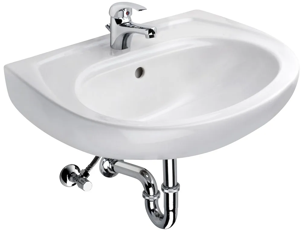 Waschtisch 60 cm, gefertigt nach DIN'' Waschtisch-Einhebelmischer mit keramisch dichtendem Steuerelement'' Flexible Anschlussschläuche'' Zug-Ablaufgarnitur 1 1/4'' Röhren-Geruchsverschluss 1 1/4'' x 32 mm'' 2 Eckventile 1/2'' 1 Satz Waschtischbefestigung'' Farbe: weiß