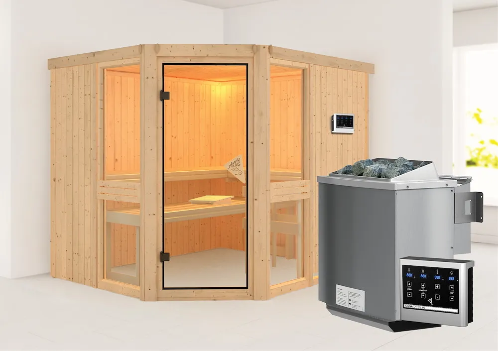 Diese Elementsauna bietet dank ihrer Wandstärke von 68 mm und der im Wandelement eingebauten Mineralwolldämmung eine hervorragende Energieeffizienz. Die vorgefertigten Wandelemente, die außen mit Softline-Profilholz verkleidet sind, sind leichter als Holz und haben gleichzeitig einen höheren Dämmwert. Darüber hinaus sind Saunen mit diesem Wandaufbau günstiger als die Produkte aus Vollholz. Die Sauna verfügt über ein Außenmaß von 231 cm x 196 cm und ein Innenmaß von 216 cm x 181 cm. Das Volumen der Sauna beträgt 7,4 cbm. Durch die formschöne Saunatür gelangen Sie ins Innere der Kabine mit Ihren 3 Liegen. Die Liegen sind ausreichend breit bemessen und bieten Ihnen die nötige Entspannung. Die Lieferung erfolgt inkl. Ofenschutzgitter. Unsere Elementsaunen haben 2 Sichtseiten und 2 Seiten, welche mit einer Hartfaserplatte ausgestattet sind.