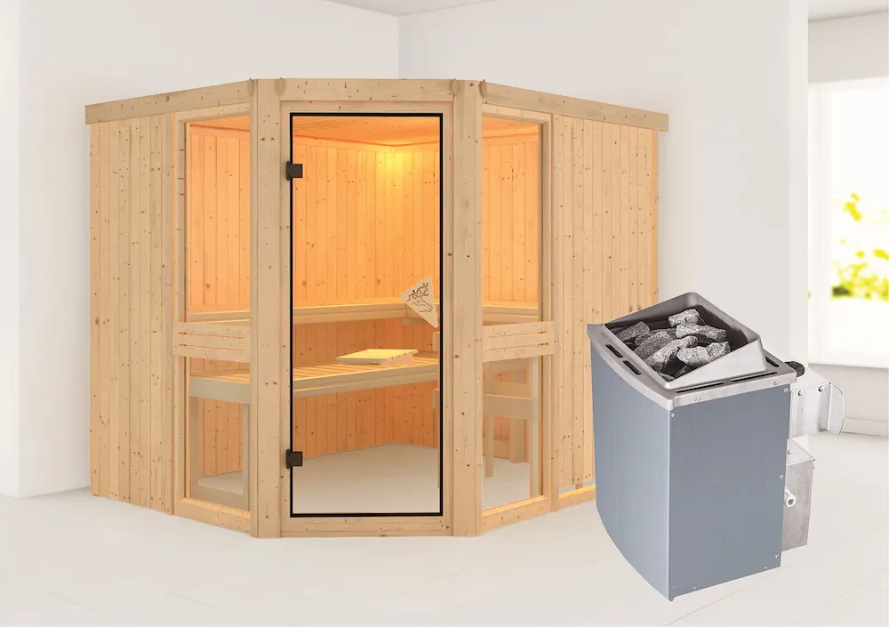Diese Elementsauna bietet dank ihrer Wandstärke von 68 mm und der im Wandelement eingebauten Mineralwolldämmung eine hervorragende Energieeffizienz. Die vorgefertigten Wandelemente, die außen mit Softline-Profilholz verkleidet sind, sind leichter als Holz und haben gleichzeitig einen höheren Dämmwert. Darüber hinaus sind Saunen mit diesem Wandaufbau günstiger als die Produkte aus Vollholz. Die Sauna verfügt über ein Außenmaß von 231 cm x 196 cm und ein Innenmaß von 216 cm x 181 cm. Das Volumen der Sauna beträgt 7,4 cbm. Durch die formschöne Saunatür gelangen Sie ins Innere der Kabine mit Ihren 3 Liegen. Die Liegen sind ausreichend breit bemessen und bieten Ihnen die nötige Entspannung. Die Lieferung erfolgt inkl. Ofenschutzgitter. Unsere Elementsaunen haben 2 Sichtseiten und 2 Seiten, welche mit einer Hartfaserplatte ausgestattet sind.