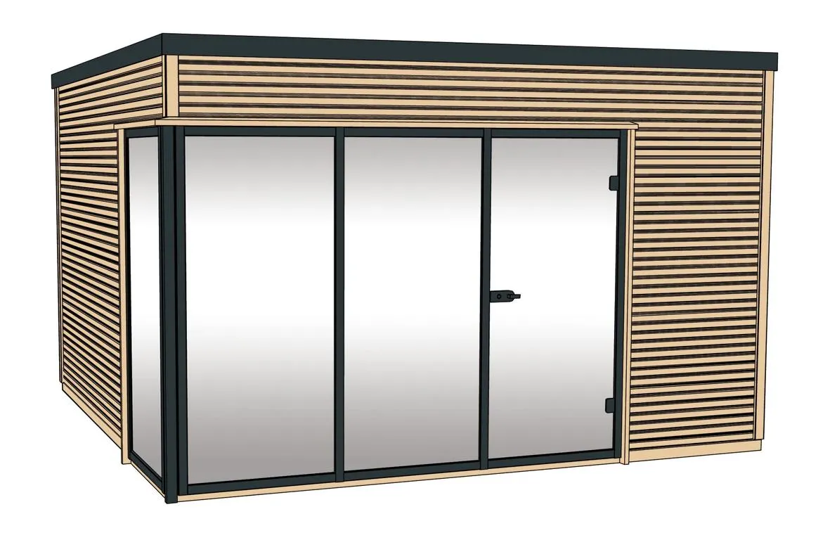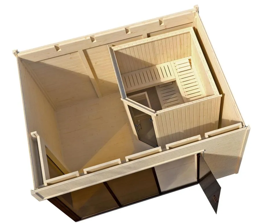 Das moderne Design-Saunahaus Cubilis ist mit dem markanten wekaLine-Bohlenprofil ein echter Hingucker in Ihrem Garten. Der elegante Look wird mit dem Flachdach, den Abschlussprofilleisten aus Aluminium und der breiten Fensterfront ergänzt. Der Innenraum bietet zudem viel zusätzlichen Platz zum Wohlfühlen und lädt damit zum entspannten Verweilen zwischen den Saunagängen ein. Für komfortables Saunieren sorgt die integrierte Elementsauna Varberg 3. Diese bietet Ihnen mit den beiden Liegen und der zusätzlichen Querliege maximalen Sitz- und Liegekomfort und garantiert Ihnen damit puren Saunagenuss. EIn 7,5 kW BioS Saunaofen (inkl. digitaler Systemsteuerung) ist im Lieferumfang enthalten.