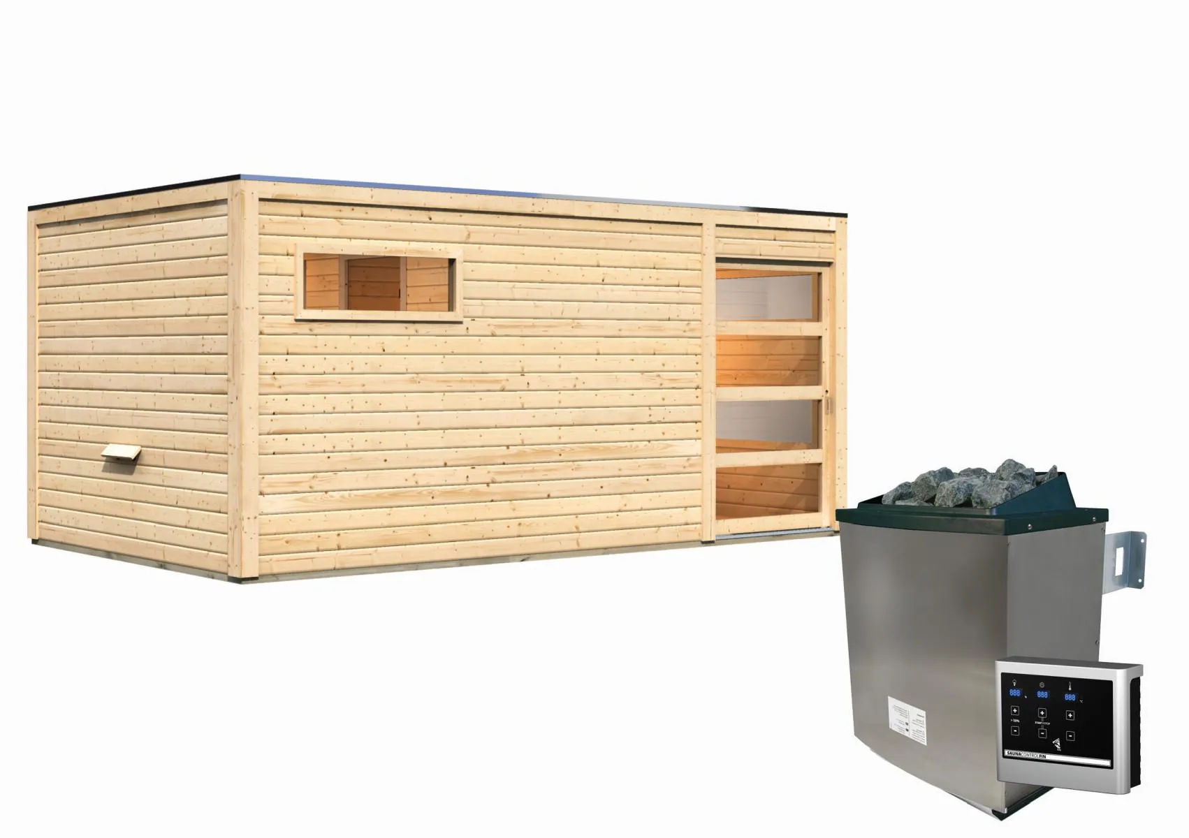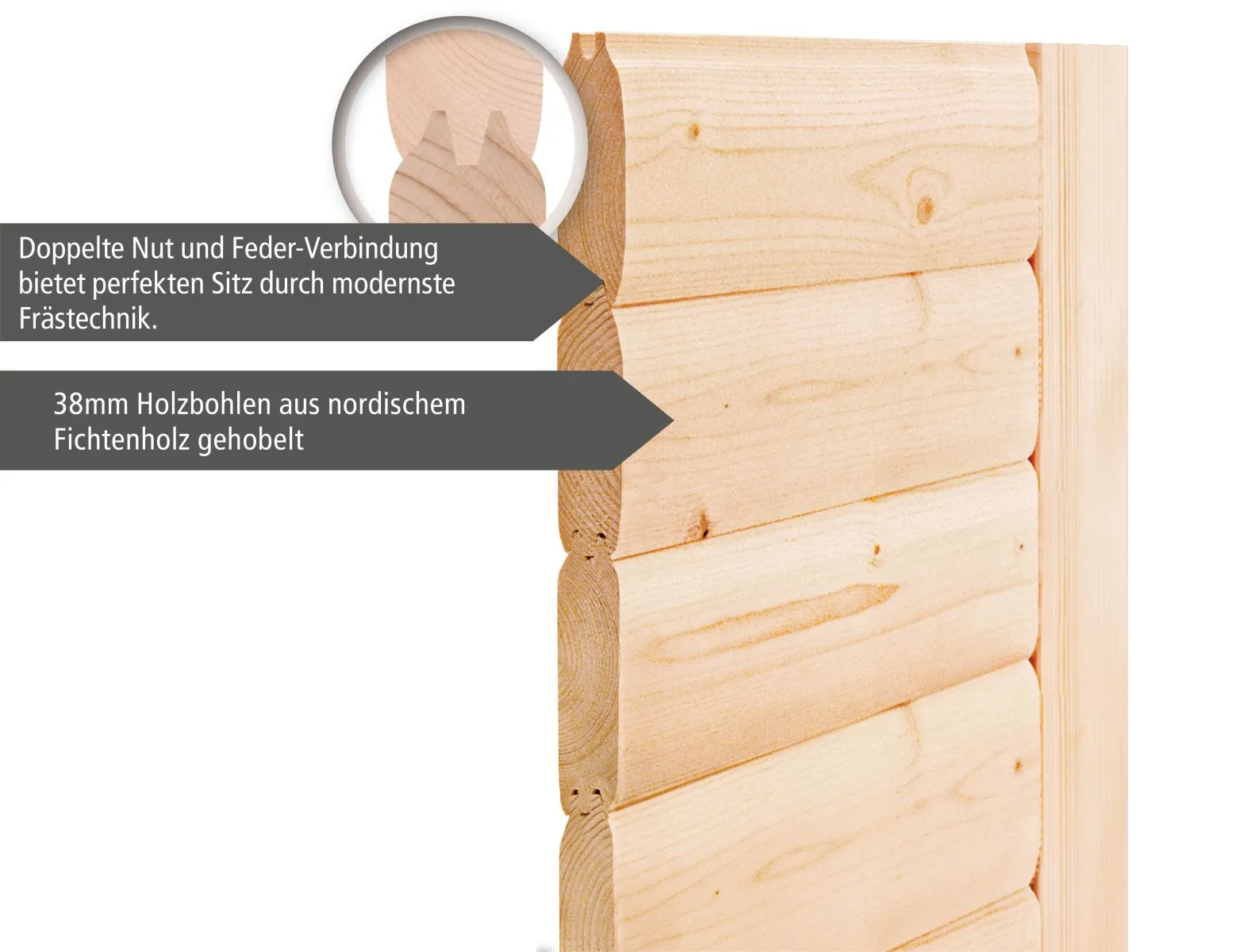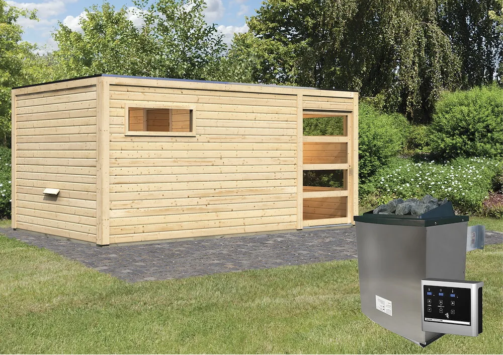 Das Saunahaus aus besten 38 mm starken Wandbrettern aus nordischer Fichte wird im Steck-/Schraubsystem montiert. Mit einem Gesamtmaß von 508 cm x 276 cm bietet es genügend Platz für ungestörte Wellnessstunden im eigenen Garten. Der Saunaraum ist mit einer Fläche von 184 cm x 264 cm natürlich ebenfalls ausreichend dimensioniert. Innen bieten 3 Saunabänke Platz zur Entspannung. Das formschöne und praktische Dach sorgt für den Witterungsschutz von oben. Für den nötigen Abstand zum Erdreich sorgen kesseldruckimprägnierte Bodenbalken. Auf diese werden die Wandbretter und die Nut- und Federbretter des Fußbodens montiert. Ein Ofenschutzgitter und alle notwendigen Schrauben und Beschläge sowie eine aussagekräftige Montageanleitung sind selbstverständlich ebenfalls dabei.