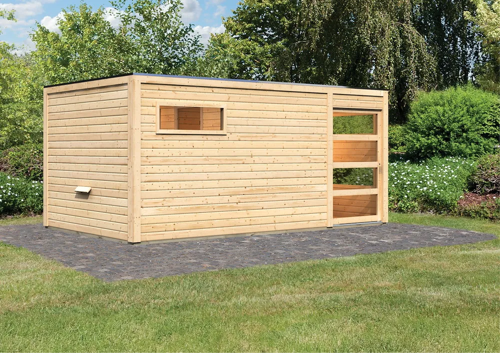 Das Saunahaus aus besten 38 mm starken Wandbrettern aus nordischer Fichte wird im Steck-/Schraubsystem montiert. Mit einem Gesamtmaß von 508 cm x 276 cm bietet es genügend Platz für ungestörte Wellnessstunden im eigenen Garten. Der Saunaraum ist mit einer Fläche von 184 cm x 264 cm natürlich ebenfalls ausreichend dimensioniert. Innen bieten 3 Saunabänke Platz zur Entspannung. Das formschöne und praktische Dach sorgt für den Witterungsschutz von oben. Für den nötigen Abstand zum Erdreich sorgen kesseldruckimprägnierte Bodenbalken. Auf diese werden die Wandbretter und die Nut- und Federbretter des Fußbodens montiert. Ein Ofenschutzgitter und alle notwendigen Schrauben und Beschläge sowie eine aussagekräftige Montageanleitung sind selbstverständlich ebenfalls dabei.