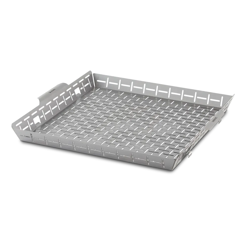 Extra großer Grillkorb (40 x 41 cm) mit hohen Seitenwänden, gelochter Oberfläche um die Speisen gut zu verteilen und Luft zirkuliern zu lassen. Der Grillkorb platziert die Speisen nahe an der Flamme, ohne dass diese zwischen die Roste fallen können.