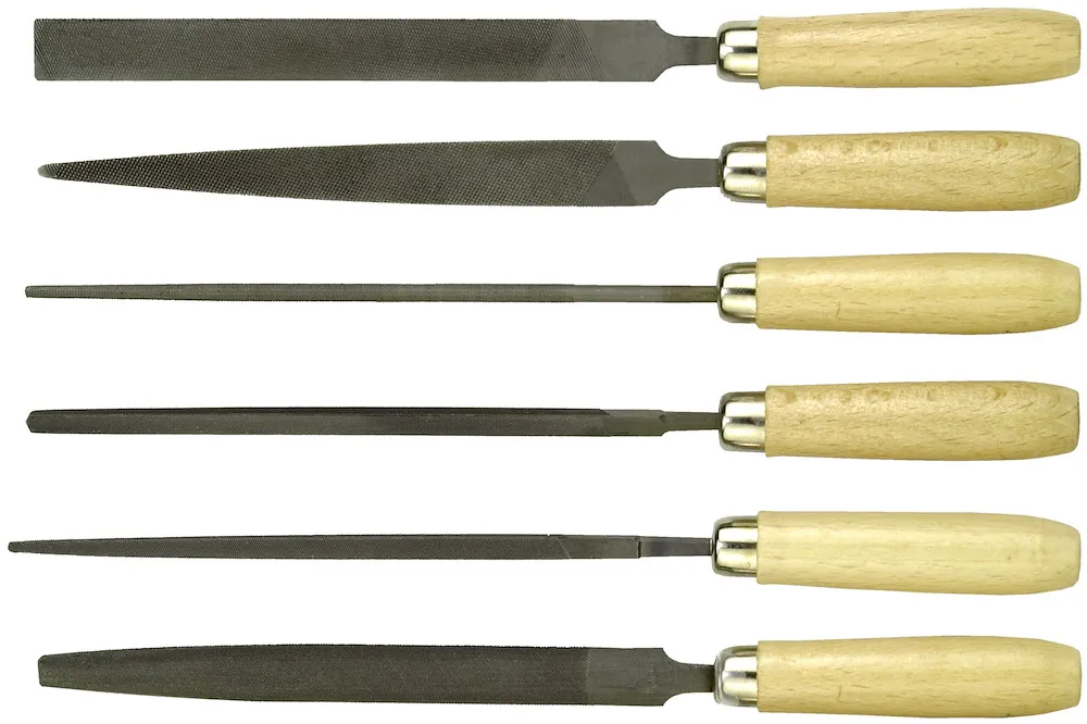 Bestehend aus: Feilen 100 mm, mit Holzheft1 Halbrund-, 1 Vierkant-, 1 Dreikant-, 1 Rund-, 1 Flachspitz-, 1 Flachstumpf-Feile (Flachfeilen mit Kantenhieb)'' In SB-Tasche