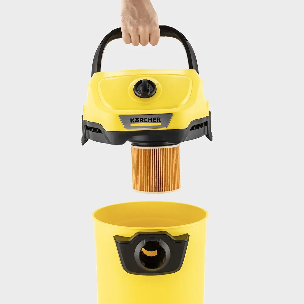 Der WD 3 V-17/4/20 ist saugstark und energieeffizient bei nur 1000 Watt Stromverbrauch. Dabei sind sowohl das Gerät als auch der Saugschlauch und die Clips-Bodendüse optimal aufeinander abgestimmt für die besten Reinigungsergebnisse bei trockenem, nassem, feinem oder grobem Schmutz. Der Nass-/Trockensauger punktet mit seiner kompakten Bauweise und einem robusten 17-Liter-Kunststoffbehälter, 4 m Kabel, 2 m Saugschlauch und seinem Vliesfilterbeutel. Dank des einteiligen Patronenfilters ist das Aufsaugen von sowohl nassem als auch trockenem Schmutz ohne Filterwechsel möglich. Die Blasfunktion ist nützlich beim Reinigen von schwer zugänglichen Stellen. Die Aufbewahrung des Schlauchs erfolgt platzsparend durch das Einhängen am Gerätekopf. Das Kabel kann am Kabelhaken verstaut werden, Rohre und Bodendüsen am Bumper. Das Pull & Push -Verschlusssystem ermöglicht einfachstes Öffnen und Schließen des Behälters. Der Handgriff des Saugers kann abgenommen und das Zubehör direkt auf den Saugschlauch gesteckt werden. Ebenfalls clever: Auf der Fläche auf dem Gerätekopf können Werkzeuge oder Kleinteile abgelegt werden. Der ergonomisch geformte Tragegriff ermöglicht den komfortablen Transport.